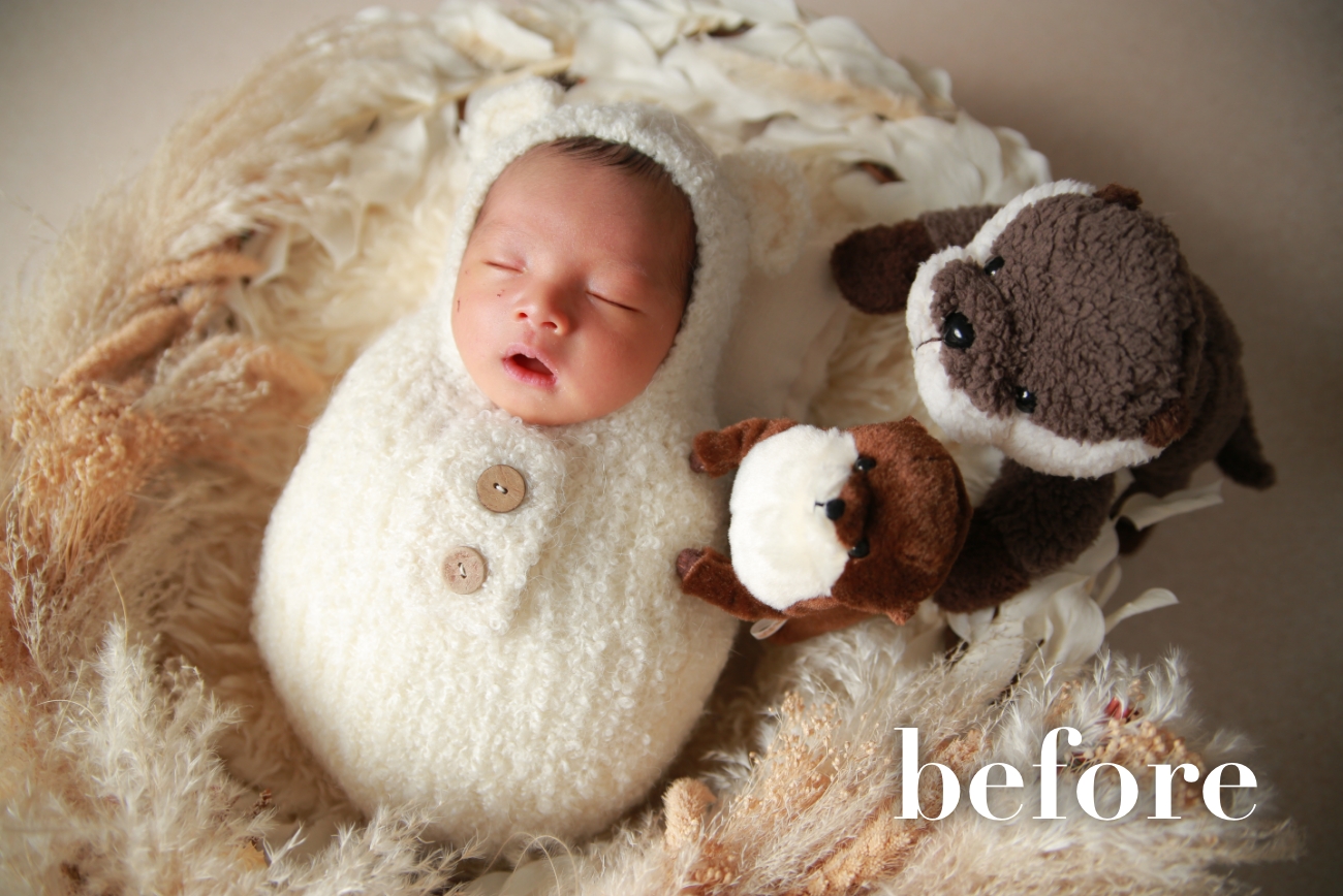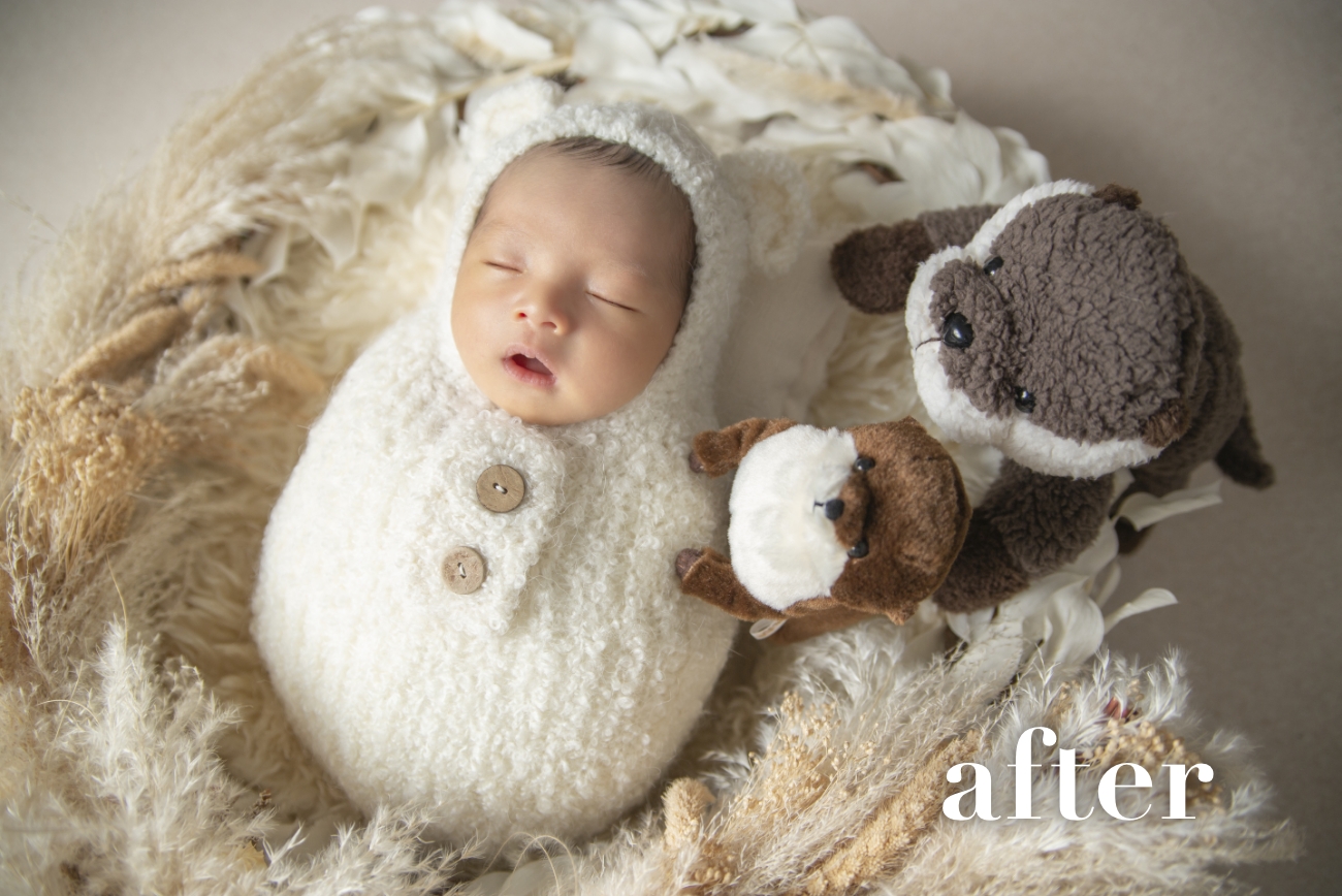 レタッチとは、色味補正や肌補正を行っております。不自然にならないように、元の肌の質感も残しながら編集をしております。(お顔の引っ掻き傷や赤み、乳児湿疹なども消しております。)
